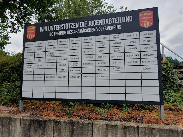 Unangefochtener Star der Gütersloher Stadionlandschaft ist das (mir immer noch fehlende) Heidewaldstadion. Damit dort in diesen Tagen die Testspiele des FC Gütersloh ausgetragen werden können, greift man zu einer reichlich absurden Maßnahme: Auf die altehrwürdigen Stehstufen wurden 300 grüne Punkte gemalt, auf denen die maximal zulässigen 300 Zuschauer während des Spiels wie angewurzelt stehenbleiben müssen, um den Mindestabstand einzuhalten. Das macht vor allem dann Freude, wenn man mit mehreren Leuten ins Stadion geht, denn eine Unterhaltung während des Spiels dürfte dadurch ja relativ unmöglich sein. Wie man hört, werden auch bei Personen aus dem gleichen Haushalt keine Ausnahmen gemacht. Nein, das ist gar nicht mein Fall, gerade beim Amateurfußball brauche ich Bewegungsfreiheit. Glücklicherweise hat die Gütersloher Stadionlandschaft noch mehr zu bieten als nur das Heidewaldstadion. Die vermutlich zweitbeste Anlage der Stadt ist das Sportzentrum West, die aus einem Rasen- und einem Kunstrasenplatz besteht. Zwischen den Plätzen steht eine Tribüne, deren Stehstufen sich nach beiden Seiten ausbreiten. Beide Plätze verfügen also über den identischen Ausbau. Laut fussball.de soll heute eigentlich auf dem Kunstrasenplatz gespielt werden, man entscheidet sich dann aber doch für den Rasenplatz. Nicht weiter schlimm, den Kunstrasenplatz kann man auch im Winter mal gut machen. Eine echte Fußballtradition besitzt das Sportzentrum West allerdings nicht. Der erst 1998 gegründete Verein Blau-Weiß Gütersloh war bis vor einigen Jahren der einzige Nutzer, ehe mit dem Aramäischen Volksverein ein zweiter Mieter hinzu kam. Die Aramäer sind inzwischen optisch deutlich stärker auf der Anlage präsent: Viele Werbebanden haben einen aramäischen Bezug, neben der Tribüne steht eine Sponsorentafel des Volksvereins und auch im Vereinsheim des Sportzentrums wird von den Aramäern geführt. Allerdings sind sie sportlich auch deutlich ambitionierter und spielen in der Bezirksliga, während die Blau-Weißen nur in der Kreisliga B herumkrebsen. Umso überraschender, dass das heutige Testspiel gegen die zweite Mannschaft von Landesligist FC Kaunitz, der in der Kreisliga A spielt, mit 4:3 gewonnen werden kann.