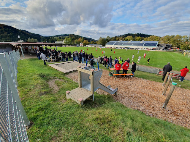 Keine 25 Kilometer von Gundelfingen entfernt erwartet uns in Elzach (7.000 Einwohner) mit einem guten Zeitpolster im Rücken das Hauptspiel des Tages. Die Sportfreunde Elzach/Yach entstanden 2002 aus einer Fusion des SC Elzach mit dem Stadtteilverein SV Yach und spielten seitdem bis vergangene Saison ununterbrochen in der Landesliga. Corona und Saisonabbruch sei Dank stiegen die Sportfreunde dann zum ersten Mal in die Verbandsliga auf. Höhepunkt in der Vereinsgeschichte des SC Elzach war das Jahr 1998, als man südbadischer Pokalsieger wurde und anschließend in der ersten Runde des DFB-Pokals auf den Hamburger SV traf, gegen den man mit 0:3 unterlag. Keine großen Erfolge bedeutet, dass die Sportanlage der Sportfreunde, die einst auch der SC Elzach genutzt hat, keinen großen Ausbau besitzt. Ein paar überdachte Stufen gibt es allerdings und natürlich ein herrliches Schwarzwald-Panorama. Genau wie zuvor in Gundelfingen wird in Elzach die Maskenpflicht rigoros durchgesetzt. Resultat: Gut 50 Zuschauer schauen sich das Spiel dann lieber als Zaungäste ohne Maske an. Die baulichen Gegebenheiten lassen das problemlos zu. Aber: Eintritt kassiert wird von den Zaungästen trotzdem. Gut für die Vereinskasse, aber es zeigt mal wieder auf, was für ein Blödsinn das alles ist. Draußen werden keine Masken getragen, keine Abstände eingehalten (drinnen übrigens auch nicht) und keine Kontaktdaten erfasst – ist das wirklich besser so? Aber wird sind ja vor allem wegen Captain Klobasa hier und der findet großen Gefallen an Landschaft und Leuten. Mit seinem Berliner Dialekt fällt er aber auch auf wie ein bunter Hund und wird mehrfach angesprochen, was er denn hier macht. Richtig ungewohnt finde ich dagegen den Aufkleber-Battle, den sich SC Freiburg und Freiburger FC in den Toiletten liefern. Sieht man selten, dass sich die beiden, ungleich großen Freiburger Szenen derart auf den Schlips treten.