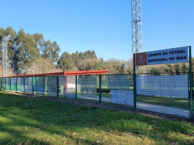 Nach einem leckeren Mittagessen setzen wir unseren Weg in den östlich von A Coruña gelegenen Vorort Oleiros fort, wo auf uns bei Atlético San Pedro abermals ein Stadion mit Ausbau wartet. Und diesmal wird dankenswerterweise nicht auf dem Nebenplatz gespielt. Zum einen ist das in Spanien im Herrenbereich aber ohnehin kein Thema, zum anderen besitzt der mit einem Kunstrasen ausgestattete Campo de Fútbol Municipal de Iñás gar keinen Nebenplatz. Einziger Nachteil ist, dass rund um das Spielfeld ein Netz gespannt wurde, so dass man hier nur einen gesiebten Blick auf die Partie erhält.